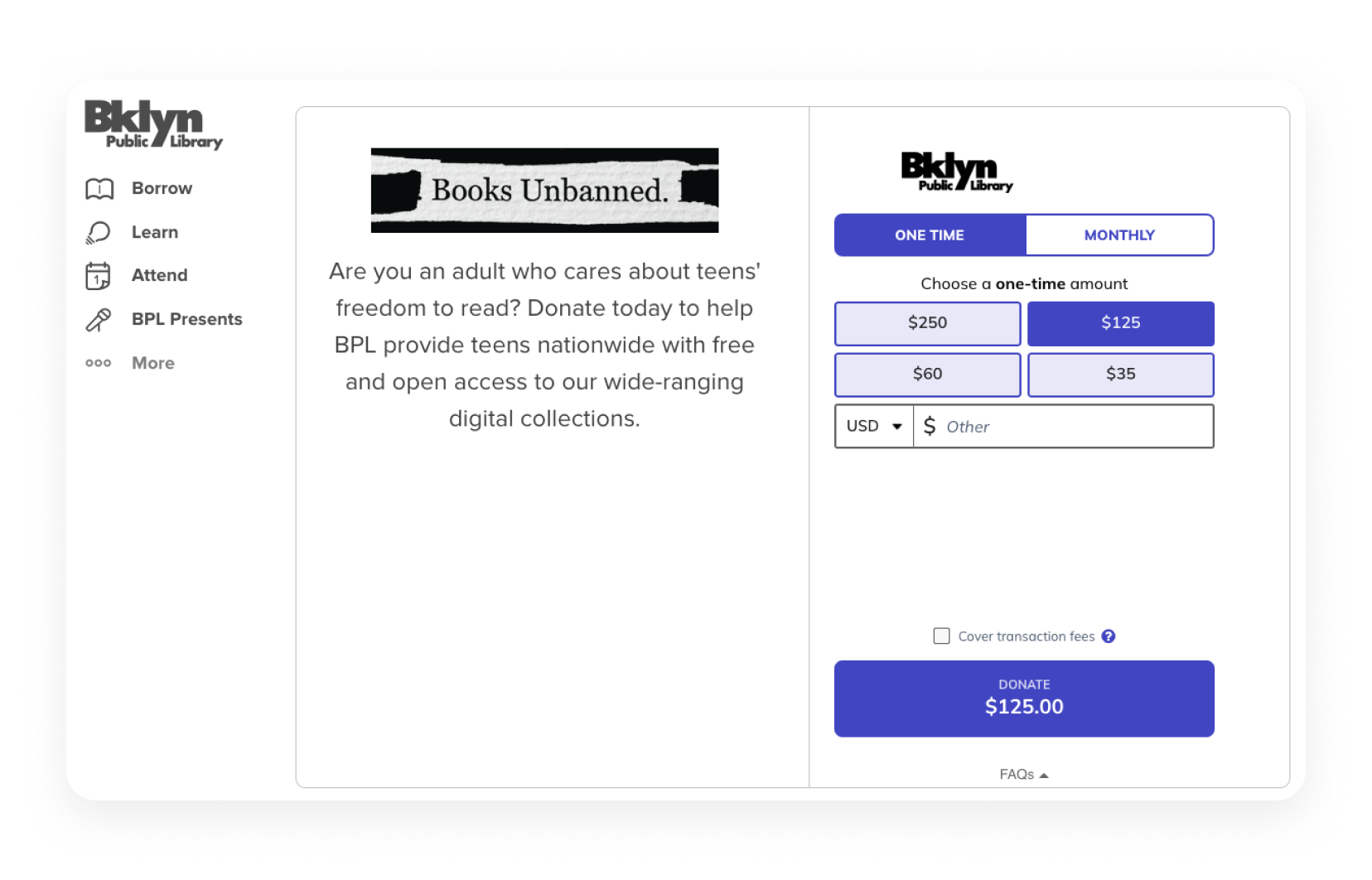 The BPL team is looking forward to seeing the donations roll in on their new inline embedded donation form on the Books Unbanned landing page. The donation experience is streamlined and frictionless, reducing the number of steps to donate and bringing in an average of 2x more revenue. It is truly a win-win for both the donor and BPL.