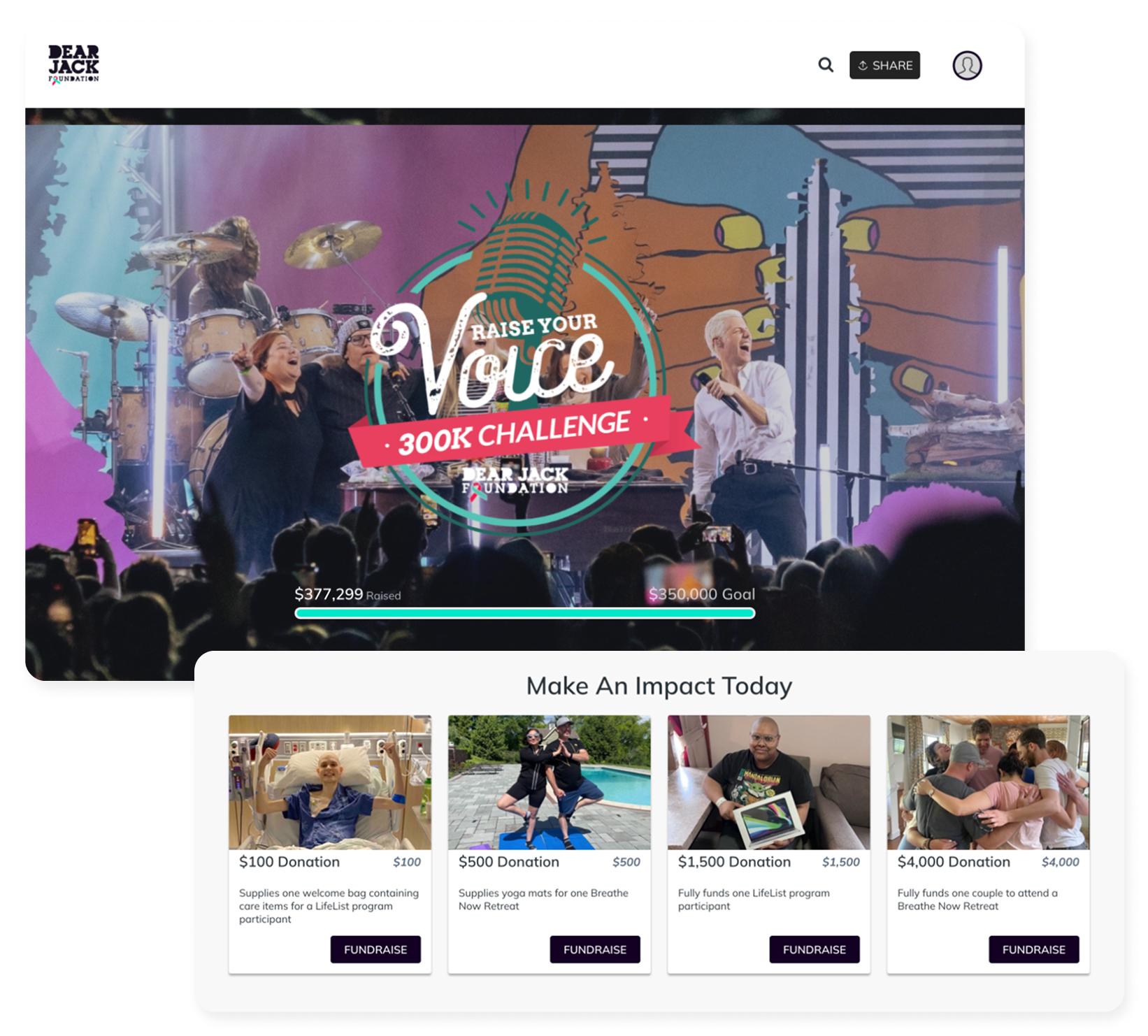 • Focus on impact: Dear Jack’s team shares exactly where all fundraising dollars go, ensuring donors and fundraisers know how many wishes or retreats they have funded.