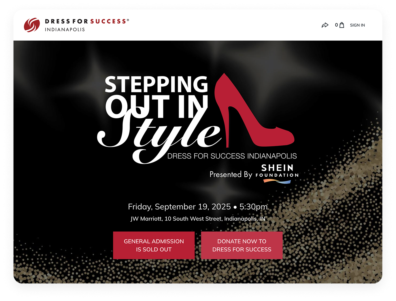 Dress for Success Indianapolis needed an events platform that could support its annual event from registration to Salesforce CRM tracking, while creating a meaningful and seamless attendee experience. GoFundMe Pro’s Live Events checked all of their boxes, so the team went all-in for the 23rd annual Stepping Out In Style fundraising event, which included a reception, a high-energy fashion show featuring community leaders, a mission moment paddle raise, and an after-party.