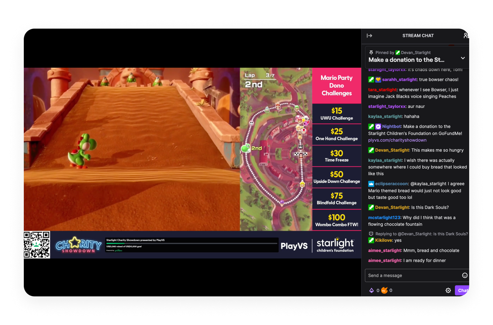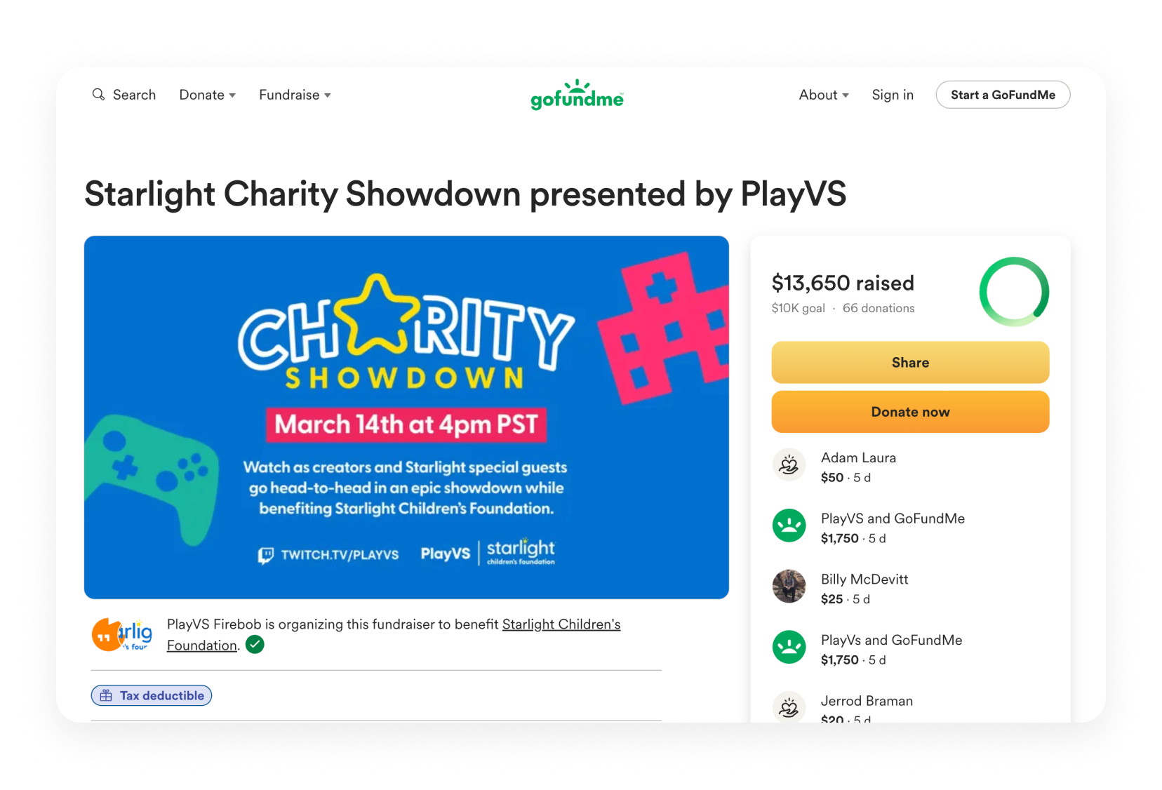 As part of this new CSR program, PlayVS began planning the Charity Showdown, a four-hour livestream event benefitting Starlight Children’s. The team was looking for a tool to make it easy for viewers to give, gamify the giving process, and tap into the competitive nature of streamers to raise money for a good cause. Seeing the potential to scale fundraising and connect with its audience in an engaging way, choosing GoFundMe’s free live fundraising tools was a no-brainer.