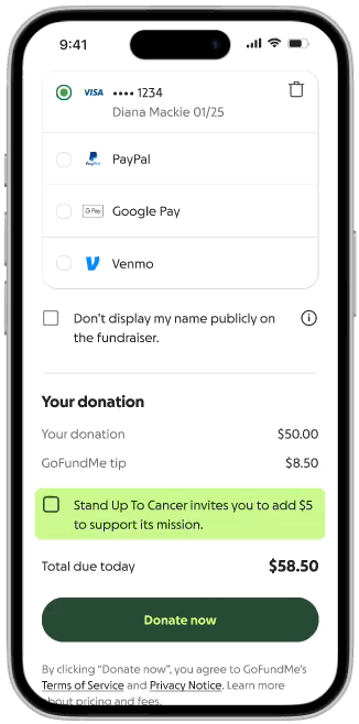 GoFundMe’s experimentation roadmap is continuously evolving, and opportunities are shaped by partner readiness, mission alignment, and platform priorities. By partnering with GoFundMe, SU2C has a critical advantage to influence product development and participation in platform-wide experiments that help reach new audiences. One such experiment involved prompting supporters who donated to a cancer-related GoFundMe fundraiser to make an optional donation to SU2C at checkout.