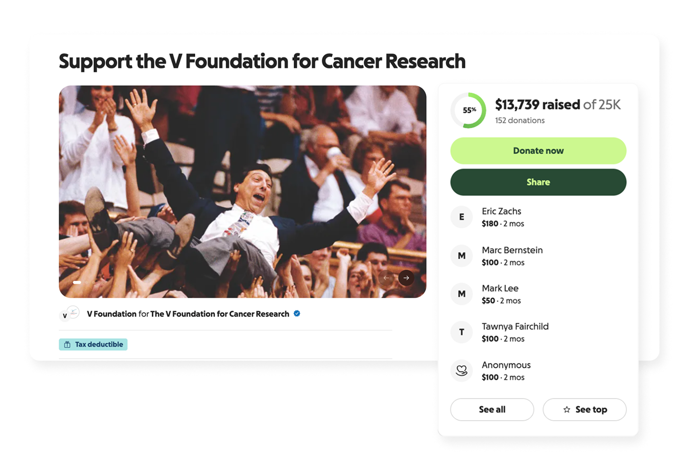 V Foundation for Cancer Research raised 10x year over year with the support of GoFundMe’s live fundraising tools