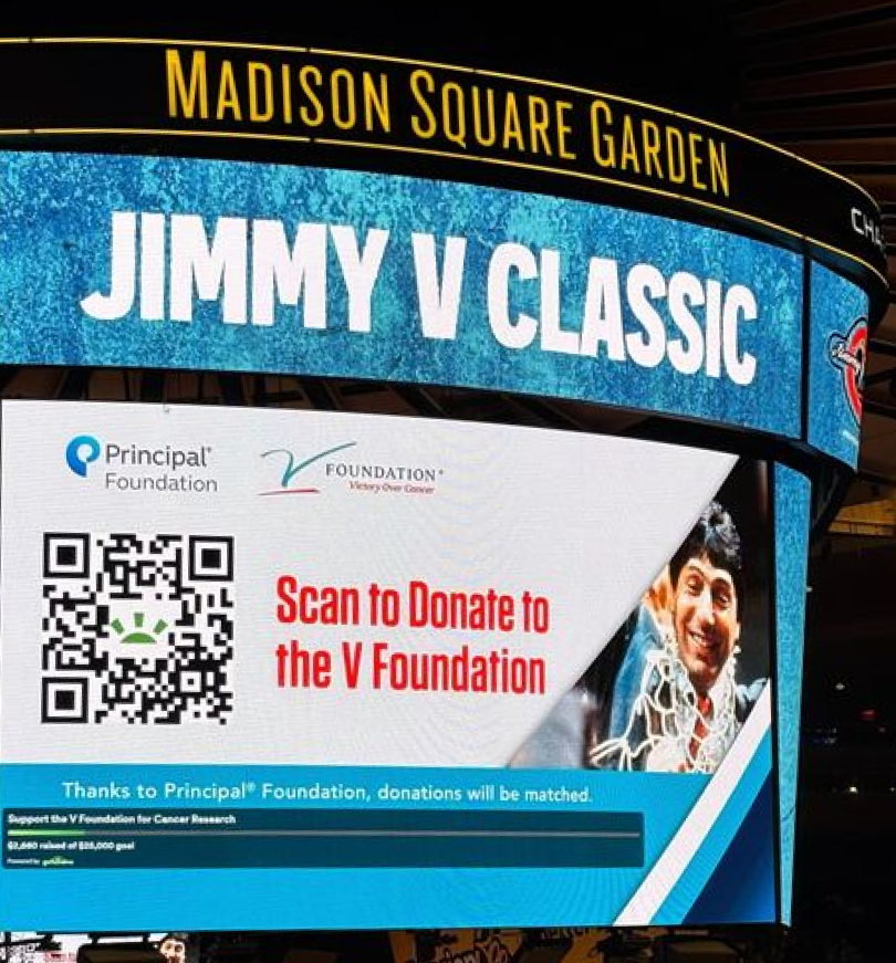 A major component of V Week is the Jimmy V Classic, an ESPN-operated college basketball showcase held at Madison Square Garden in New York City. The Jimmy V Classic is a crucial activation, which the V Foundation uses as a high-visibility moment to drive donations. After feeling inspired by other success stories in major arenas across the country, the V Foundation team decided to test GoFundMe’s live fundraising tools.