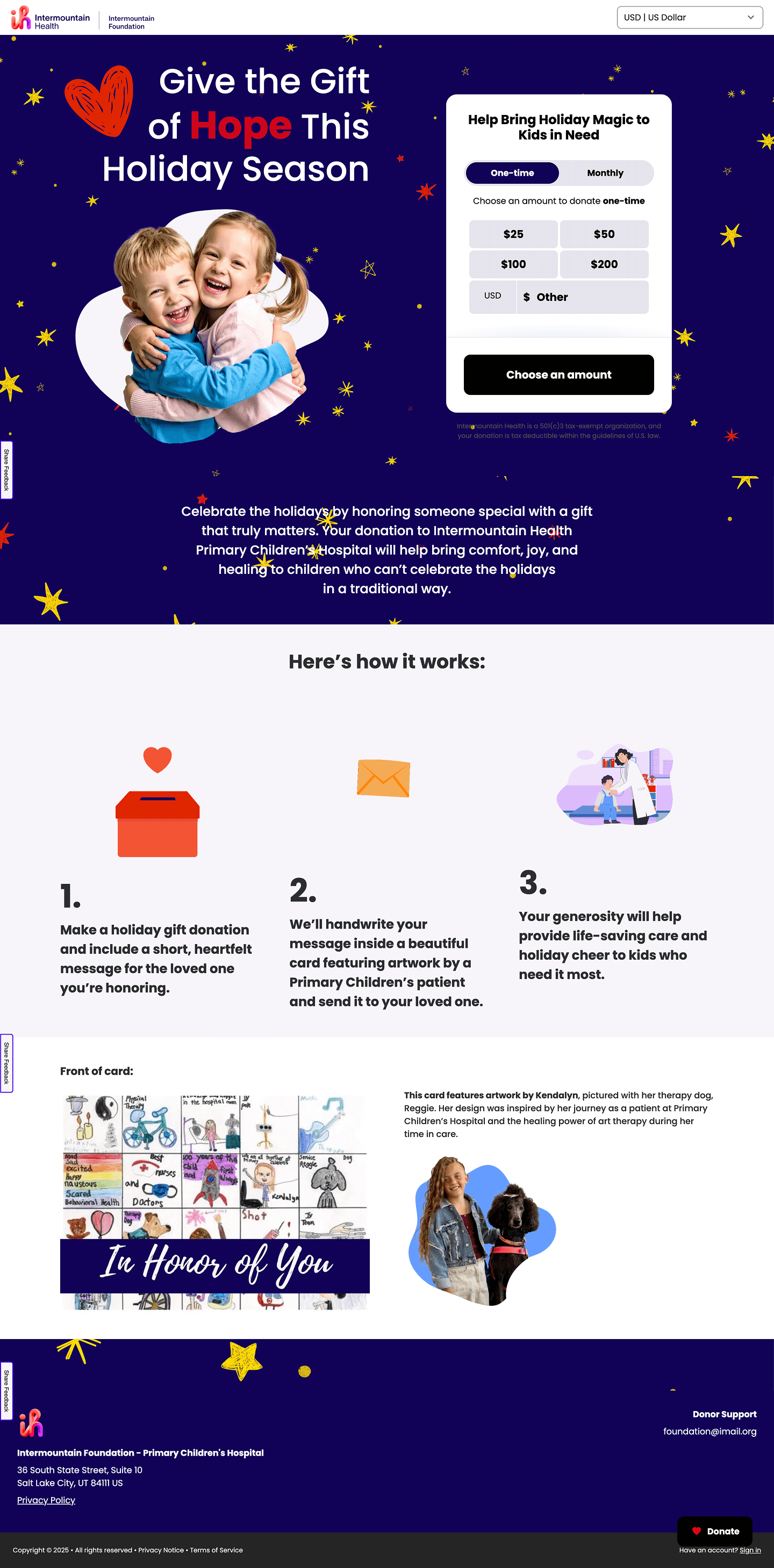Why it inspires: The use of a multi-section layout allows for mixed visuals and copy that implores visitors to help improve the mental and emotional well-being of children in the hospital.