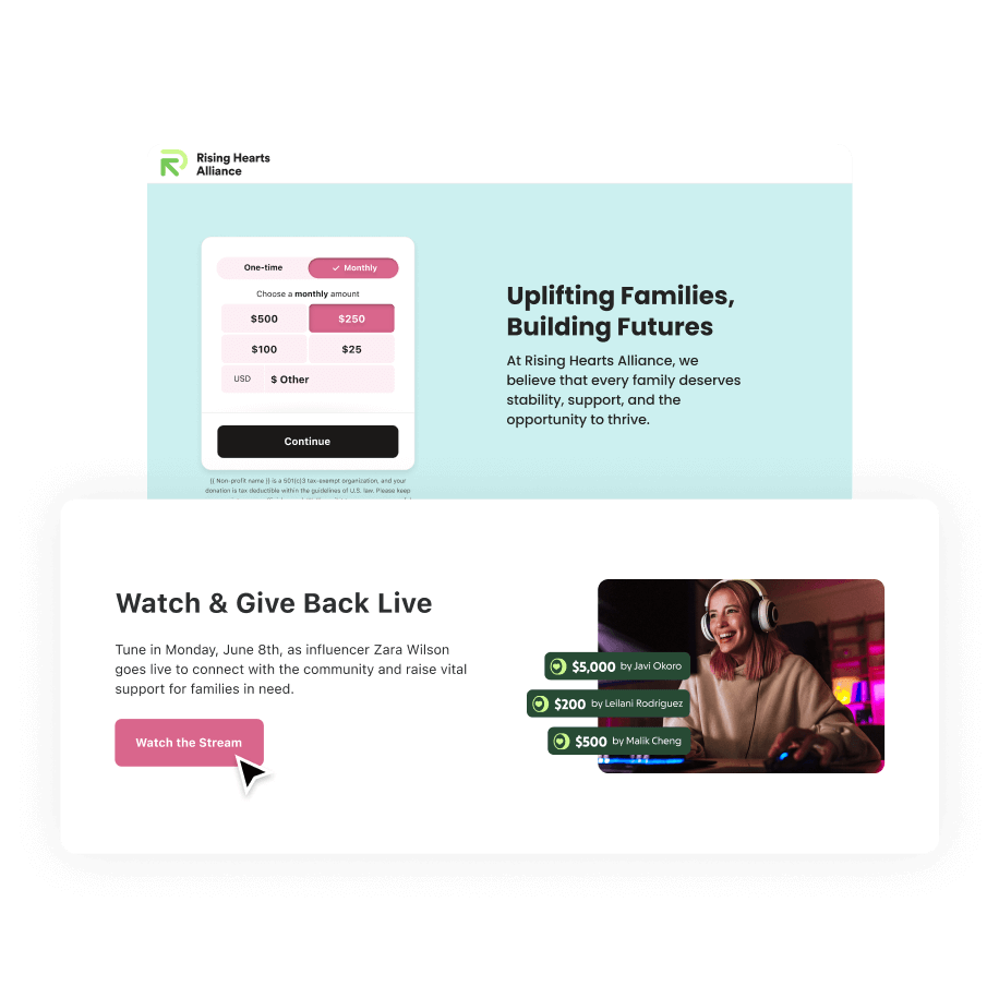 Activate creators and their audiences, with custom campaigns, livestream fundraising, and more.